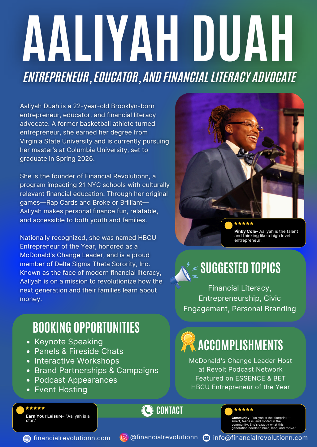 Founder & Lead Facilitator Entrepreneur, educator, and advocate dedicated to helping youth understand money, mindset, and self-empowerment.